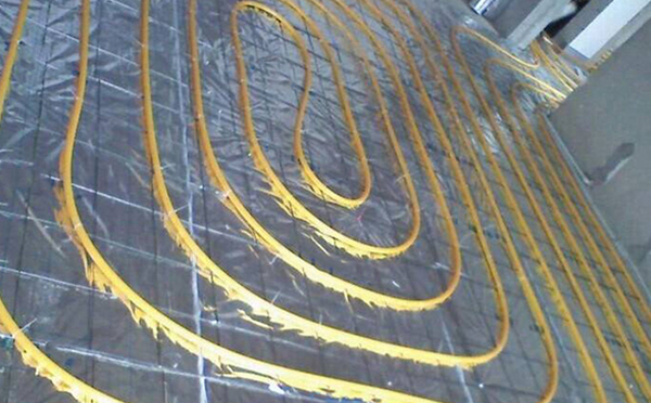 施工準備→材料準備→安裝分水器→連接主管→鋪設保溫層、邊界膨脹帶→鋪設反射鋁箔層→鋪設盤管→連接分水器→根據施工圖進行埋地管材鋪設→設置過門伸縮縫→中間驗收(一次水壓試驗)→細石混凝土填充層施工→完工驗收(二次水壓試驗)→運行調試